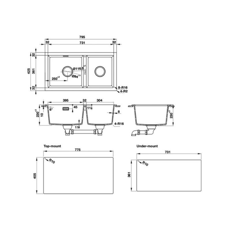 - Lắp nổi : D775 x R405mm